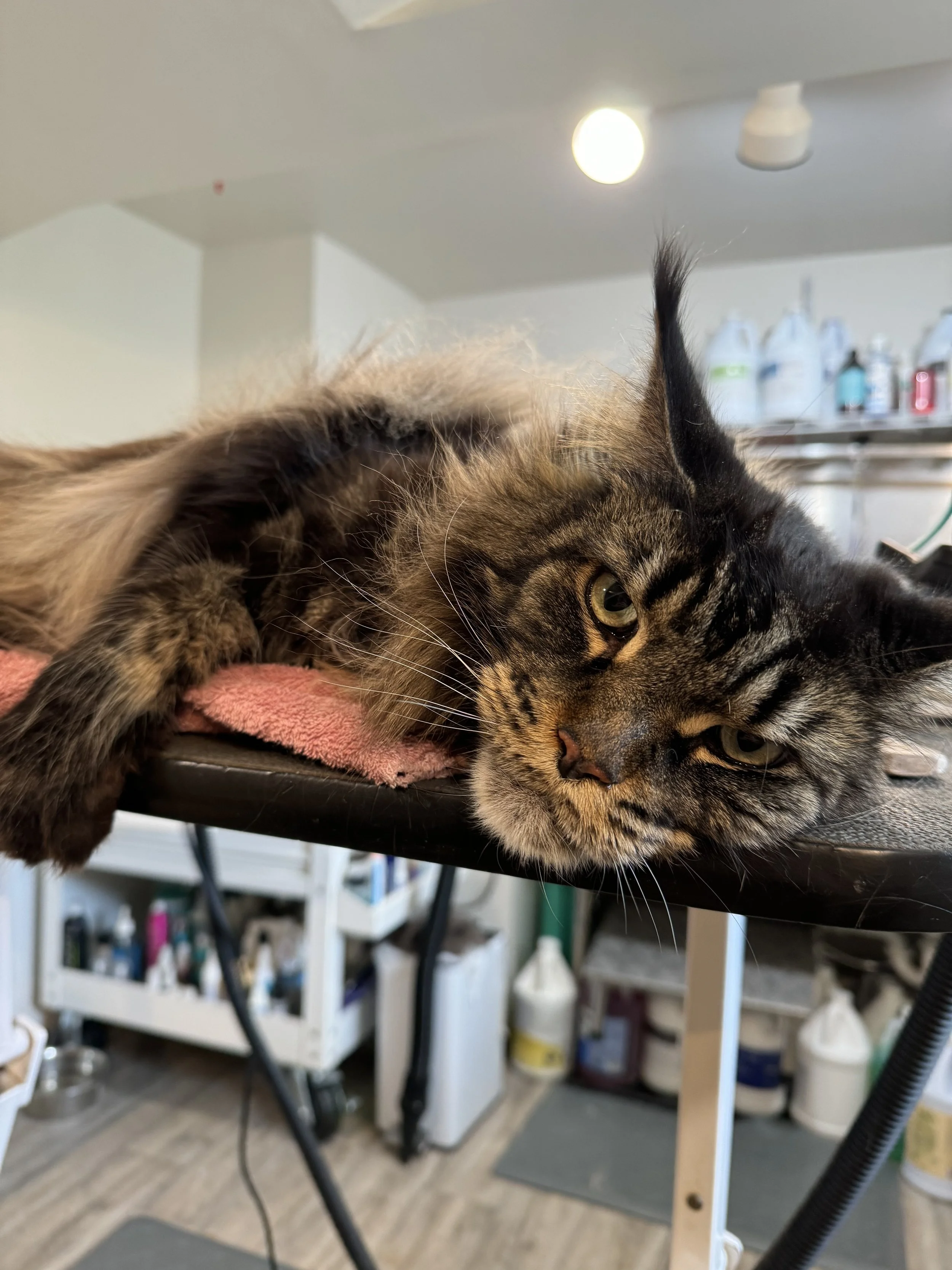 Each cat is given a Groomer’s Exam to identify matts, tangles, skin irritation, etc. We then can decide what is best for your cat based on coat condition , overall health and temperament.